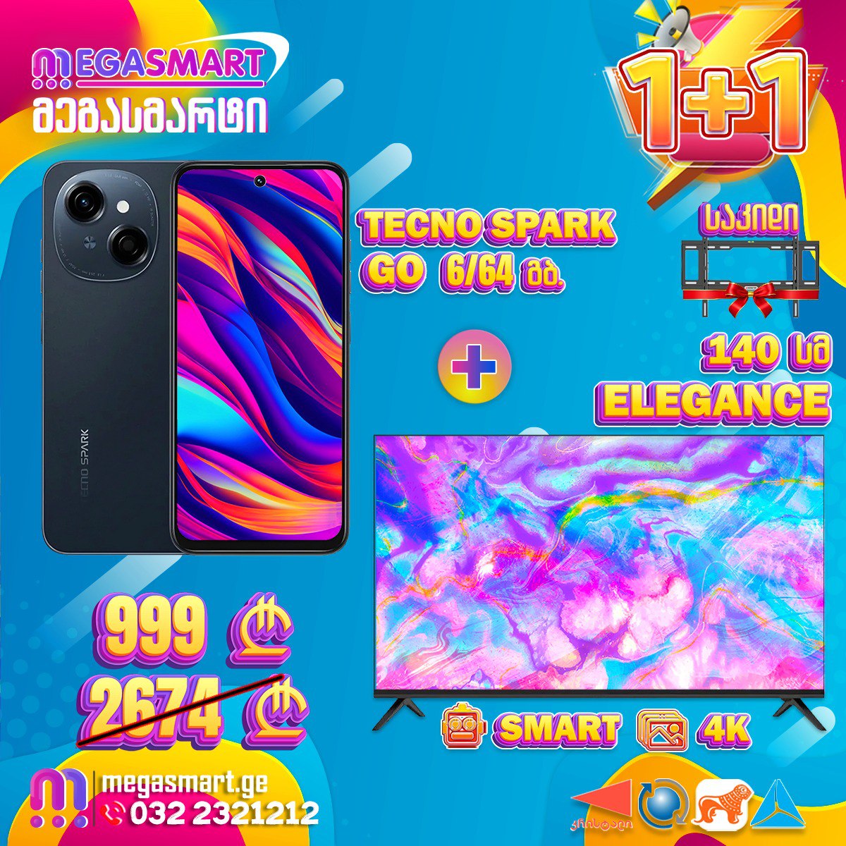 ტელევიზორი 140სმ ELEGANCE 55KV77S სმარტი 4K ანდროიდი საჩუქრად საკიდი და მობილური TECNO SPARK GO Black 6GB/64GB